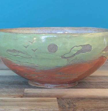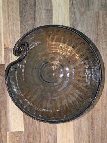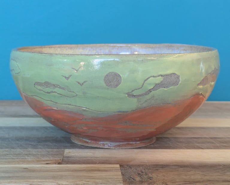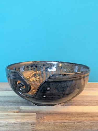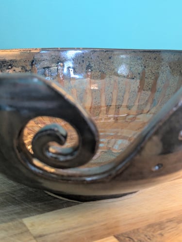 Experimenting with carving also started with a little under the sea themed round vase, then I started throwing bigger, and threw a couple of large bowls. The first was an experiment with scraffito, and the second was a very carefully constructed yarn bowl. The yarn bowl is the inspiration for this website. I have never created something I was so proud of, and hope to continue making and experimenting for a while to come.